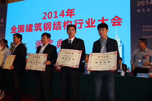 開幕式上,中國建筑金屬協會對鋼結構企業和個人進行了頒獎,山東經典建設工程有限公司被授予2014-2016年中國建筑鋼結構行業推薦品牌信譽AAA企業,經典集團副總經理鄭建康上臺領取了證書。經典集團還參加了“四新”推廣交流會、技術論壇、鋼結構配套產品展示活動等。