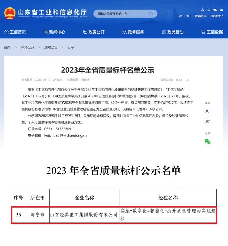 日前,山東省工業(yè)和信息化廳組織開展的“2023年全省質(zhì)量標桿”遴選結(jié)果正式公布。其中,經(jīng)典重工集團股份有限公司的“實施‘數(shù)字化+智能化’提升質(zhì)量管理的實踐經(jīng)驗”獲評全省質(zhì)量標桿。