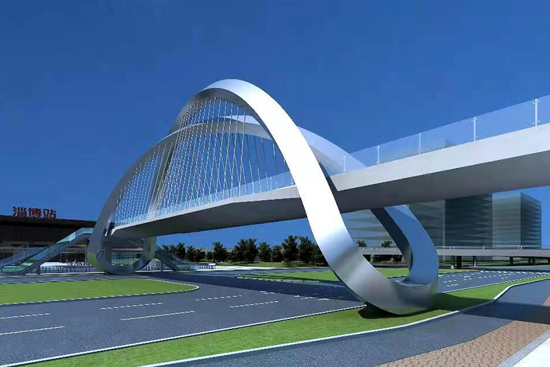 此項目位于淄博火車站南廣場的中心,結構造型復雜,拱梁為雙曲構件,加工難度大,裝配精度高,焊接變形量要求極高,我們作為項目的重點供應商,向其提供了1000噸鋼結構用量,其中難度最高的異形構件全部由我們制作。