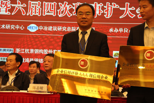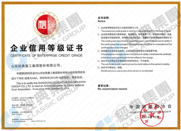 2014年10月26-27日,在南京國際會議中心隆重舉辦的中國鋼結構協會成立三十周年紀念大會暨六屆四次理事會擴大會議上,山東經典重工集團股份有限公司獲得首批全國鋼結構行業AAA級信用企業。