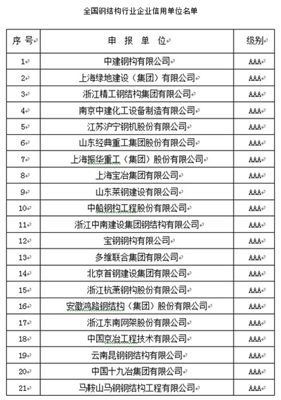 AAA信用評選由國家商務部、國資委、國家鋼結構專家委員會面向全國3500余家鋼結構制造、設計、建筑企業,經過層層選拔、資格初審復審、專家集中評審及面向社會公示后,中建鋼構、上海綠地集團、上海寶冶、杭蕭鋼構、首鋼集團、寶鋼集團、振華重工等21家國有大型企業被評定為首批全國鋼結構行業AAA級信用企業,山東經典重工集團股份有限公司成為唯一獲此殊榮的山東省民營企業。