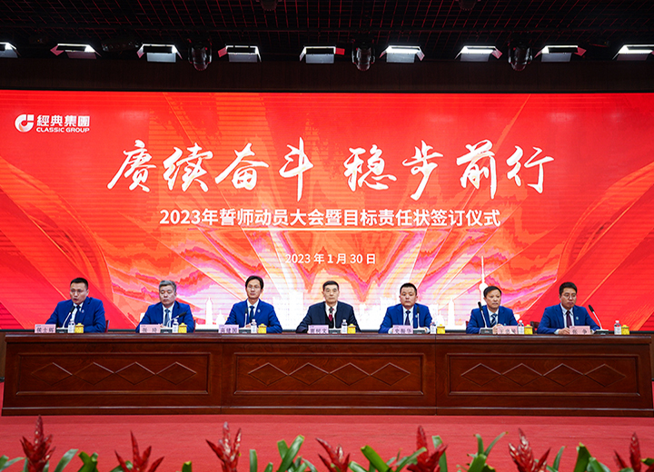 賡續(xù)奮斗 穩(wěn)步前行 經(jīng)典集團2023年誓師動員大會暨目標責任狀簽訂儀式召開。