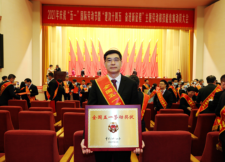 公司榮獲全國五一勞動獎狀,集團董事長苗樹文登臺領(lǐng)獎。