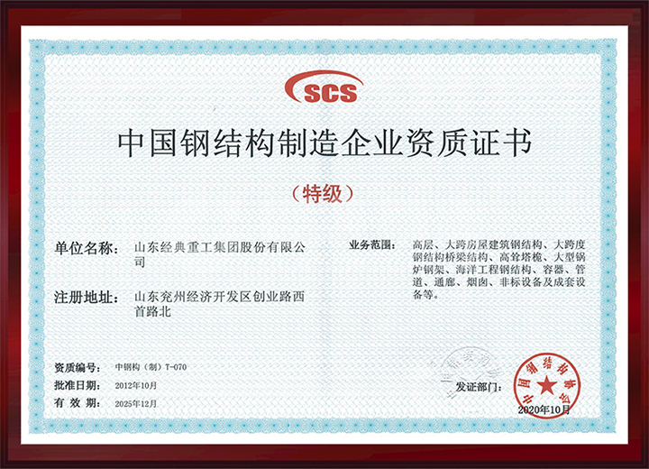 取得中國鋼結(jié)構(gòu)制造特級資質(zhì)。