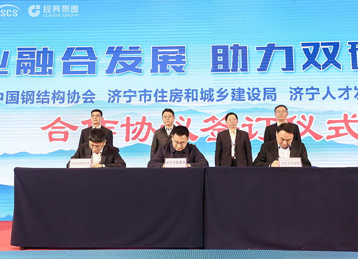 中國鋼結(jié)構(gòu)協(xié)會、濟寧市住房和城鄉(xiāng)建設(shè)局、濟寧人才發(fā)展集團三方人才合作簽約儀式。