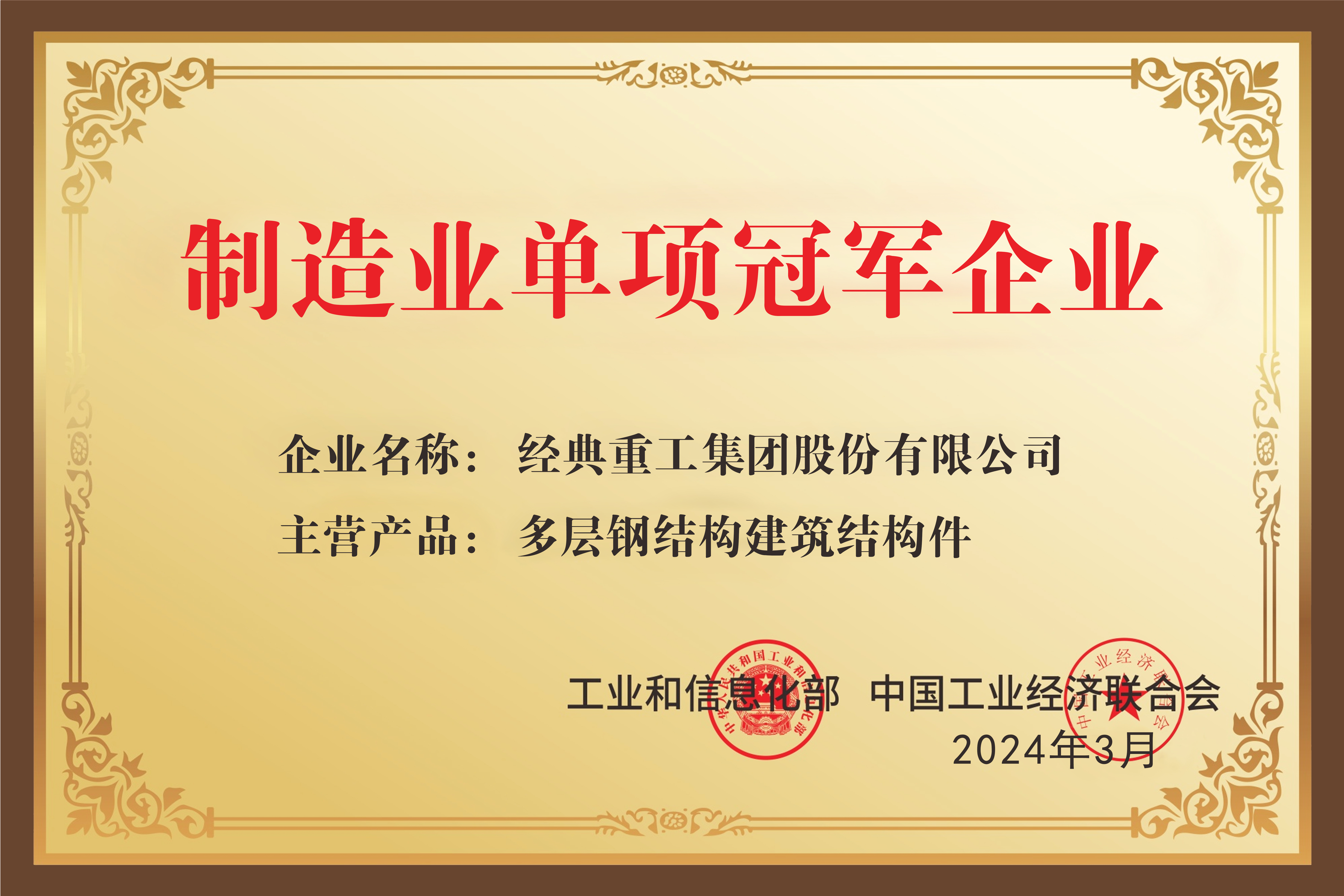 經(jīng)典集團榮獲“國家級制造業(yè)單項冠軍示范企業(yè)”稱號。