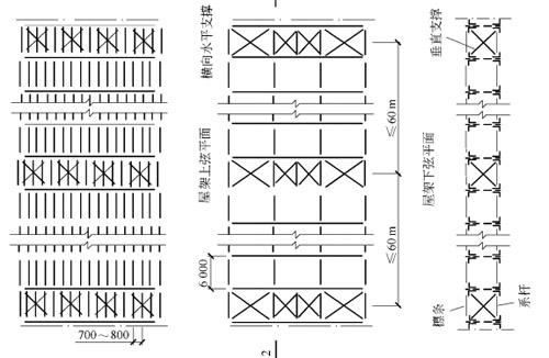 垂直支撐位于上、下弦橫向水平支撐同一開間內,形成一個跨長為屋架間距的平行弦桁架。它的上、下弦桿分別為上、下弦橫向水平支撐的豎桿,它的端豎桿就是屋架的豎桿(或斜腹桿)。垂直支撐中央腹桿的形式由支撐桁架的高跨比決定,一般常采用W形或雙節間交叉斜桿等形式。腹桿截面可采用單角鋼或雙角鋼T形截面。